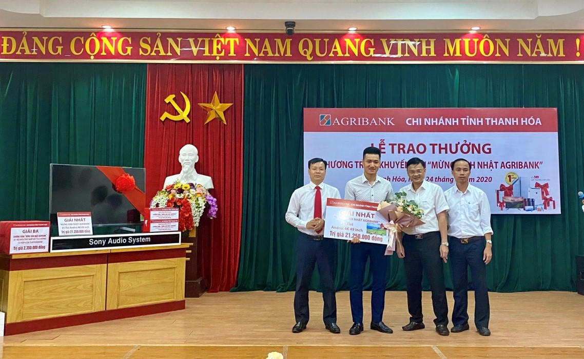 Kết thúc chương trình, Agribank Thanh Hóa có 15 khách hàng may mắn trúng các giải thưởng có giá trị. Trong đó, có 01 khách hàng giao dịch tại Agribank Chi nhánh huyện Ngọc Lặc Thanh Hóa đã trúng Giải nhất của chương trình là 01 Tivi Androi 4K 49 inch KD-49X8500G/S trị giá 21.250.000 đồng; 01 khách hàng giao dịch tại Agribank Chi nhánh Lam Sơn Thanh Hóa trúng giải may mắn là 01 máy giặt sấy Samsung Addwash Inverter 9.5kg WD95K5410OX/SV trị giá giải thưởng là 19.750.000 đồng; Ngoài ra còn có 03 khách hàng trúng giải ba, mỗi giải là một Bộ đôi hoàn hảo trữ mát và trữ đông 13 hộp của Tupperware trị giá 2.350.000 đồng và 10 khách hàng trúng giải khuyến khích, mỗi giải là 01 Bình giữ nhiệt Lock&Lock LHC1427DG trị giá 900.000 đồng.