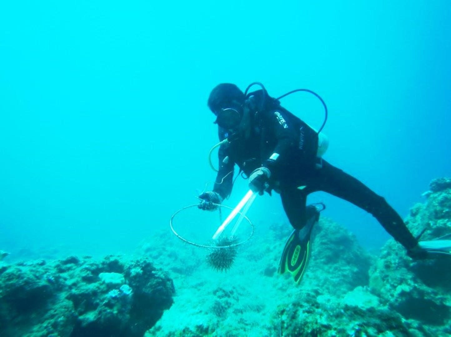 Thợ lặn bắt sao biển gai tại phân khu bảo vệ nghiêm ngặt khu bảo tồn biển Lý Sơn, Quảng Ngãi. |
