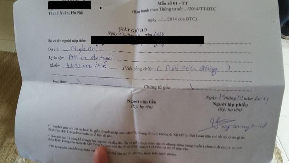 Vừa nói, học viên liền cho chúng tôi xem các phiếu thu trên tay. Điều lạ lùng là mọi hóa đơn thu tiền ngoài chữ ký của người nộp tiền cũng như nhận tiền thì đều không có bất kỳ dấu chức danh của Kế toán trưởng và người đứng đầu Công ty theo quy định về quản lý hóa đơn của Bộ Tài Chính. Ngay cả trên hóa đơn cũng không thể hiện thông tin của công ty có trách nhiệm đưa người đi lao động.
