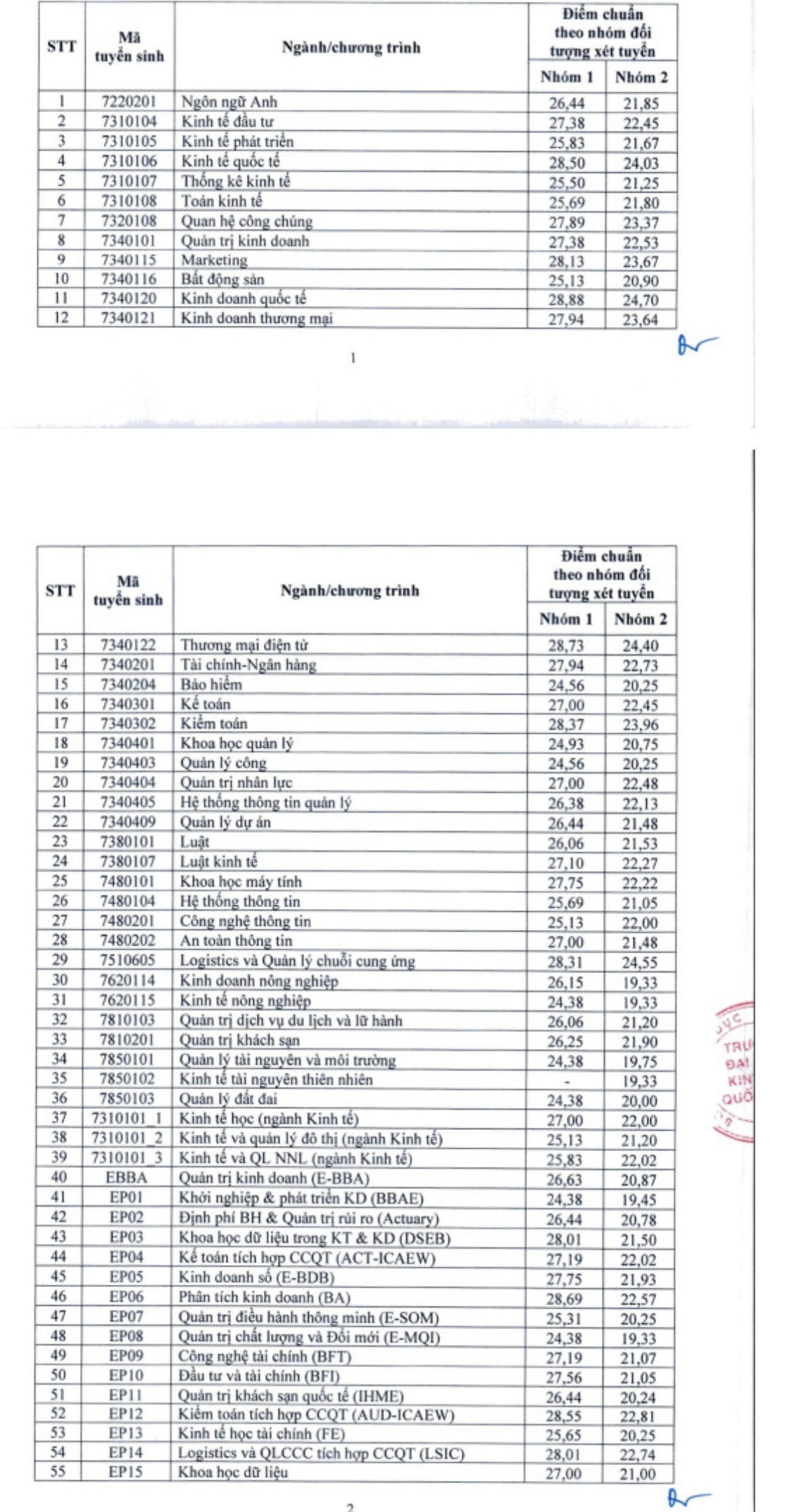 Trường Đại học Kinh tế Quốc dân vừa thông báo điểm chuẩn sớm theo phương thức xét tuyển kết hợp, nhóm 1 và 2.