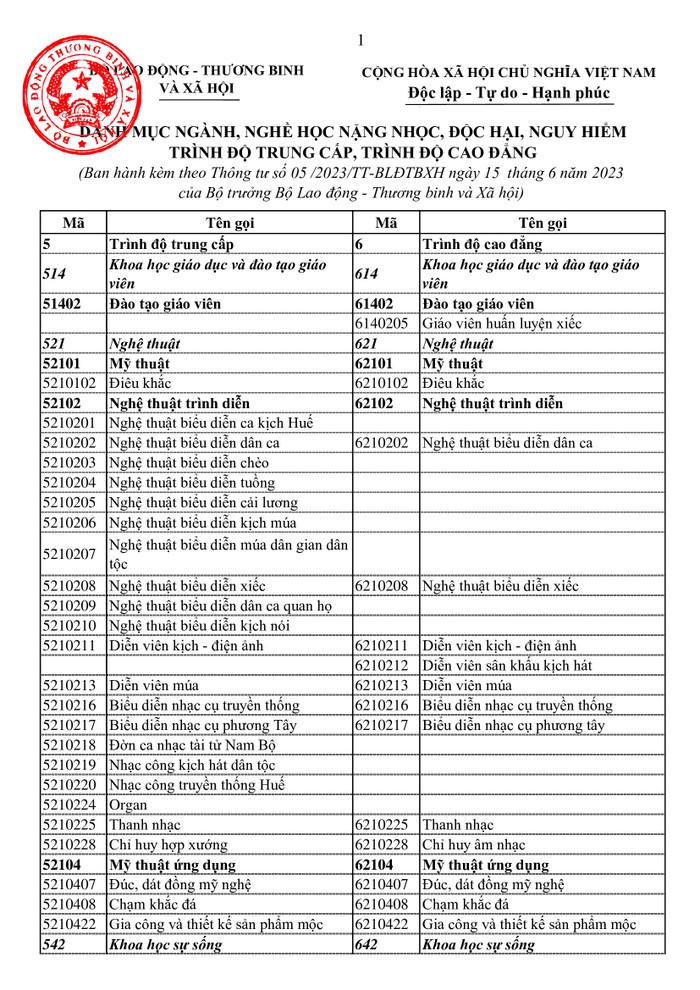 Bộ Lao động TBXH mới ban hành Thông tư 05/2023/TT-BLĐTBXH về Danh mục ngành, nghề học nặng nhọc, độc hại, nguy hiểm trình độ TC, CĐ thay thế Thông tư 36/2017/TT-BLĐTBXH.