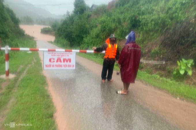 Biên phòng tại Ba Nang dựng rào chắn, ngăn không cho người dân qua ngầm tràn Ly Tôn, sáng 17/10. Ảnh: Quang Hà