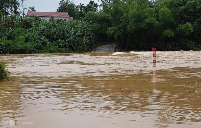 Cầu ngầm sông Trường trên quốc lộ 40B, xã Trà Tân, huyện Bắc Trà My ngập hơn 1,2 m, sáng 17/10. Ảnh: Trà My