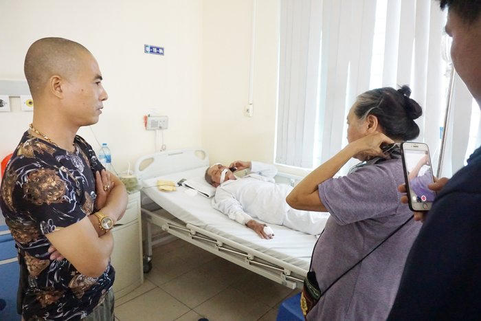 Nhìn thấy hình ảnh ông Lâm trên giường bệnh ai ai cũng cảm thấy vô cùng xót xa. Vợ ông là bà Thơm luôn túc trực bên cạnh. Người nhà tài xế xe ôm hành hung ông Lâm cũng có mặt để chăm sóc cho nạn nhân.