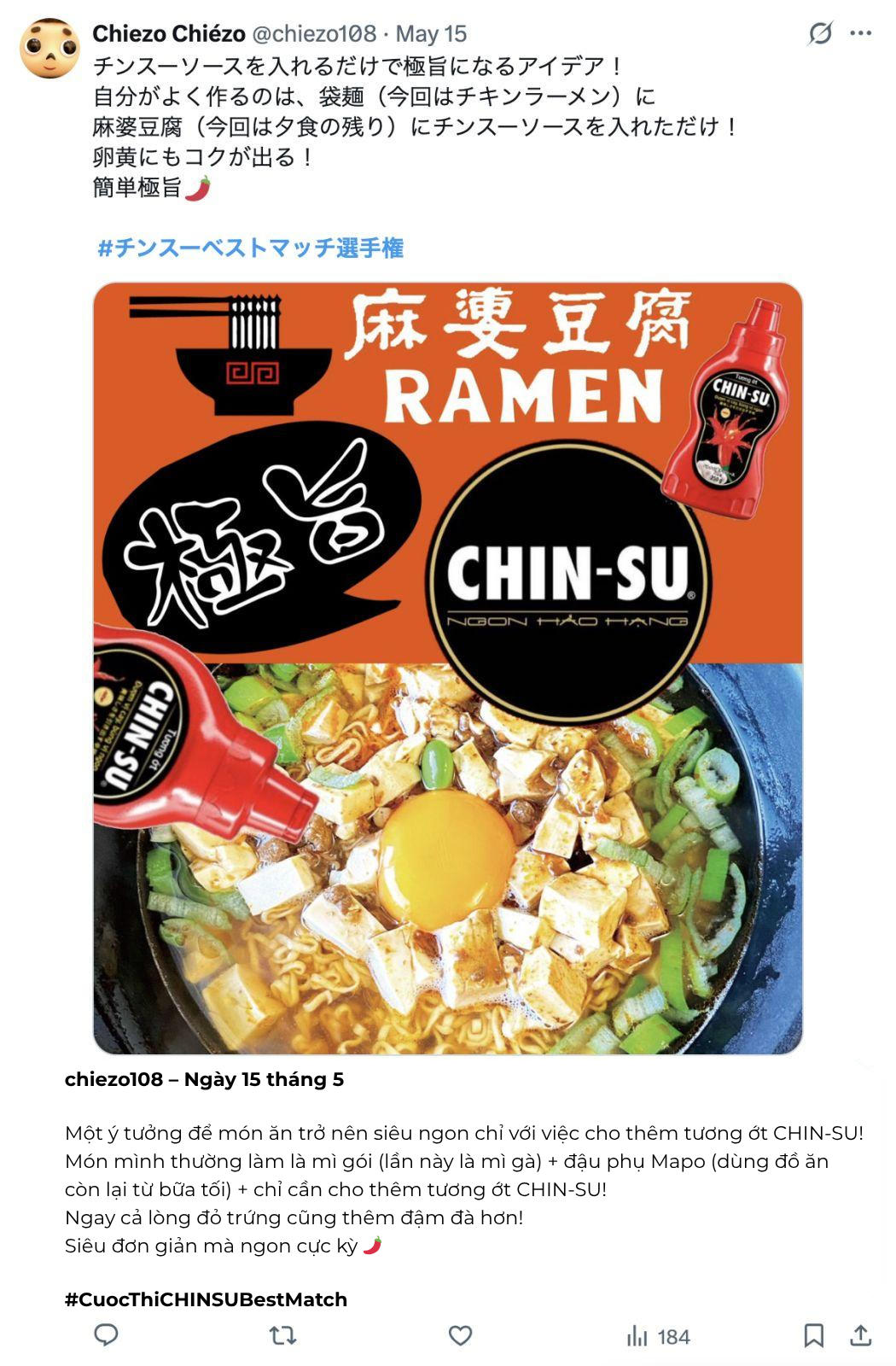 Yêu thích ẩm thực, yêu thích Việt Nam, vừa qua, giới trẻ Nhật Bản hào hứng chia sẻ những khoảnh khắc kết hợp các món ăn với tương ớt Chinsu để có cơ hội nhận về chuyến du lịch tới đất nước Việt Nam xinh đẹp. Các bạn trẻ tỏ ra thích thú khi chỉ với thao tác đơn giản, cho thêm tương ớt Chinsu đã có ngay một cách thưởng thức những món ăn thường ngày đầy mới mẻ, thú vị.