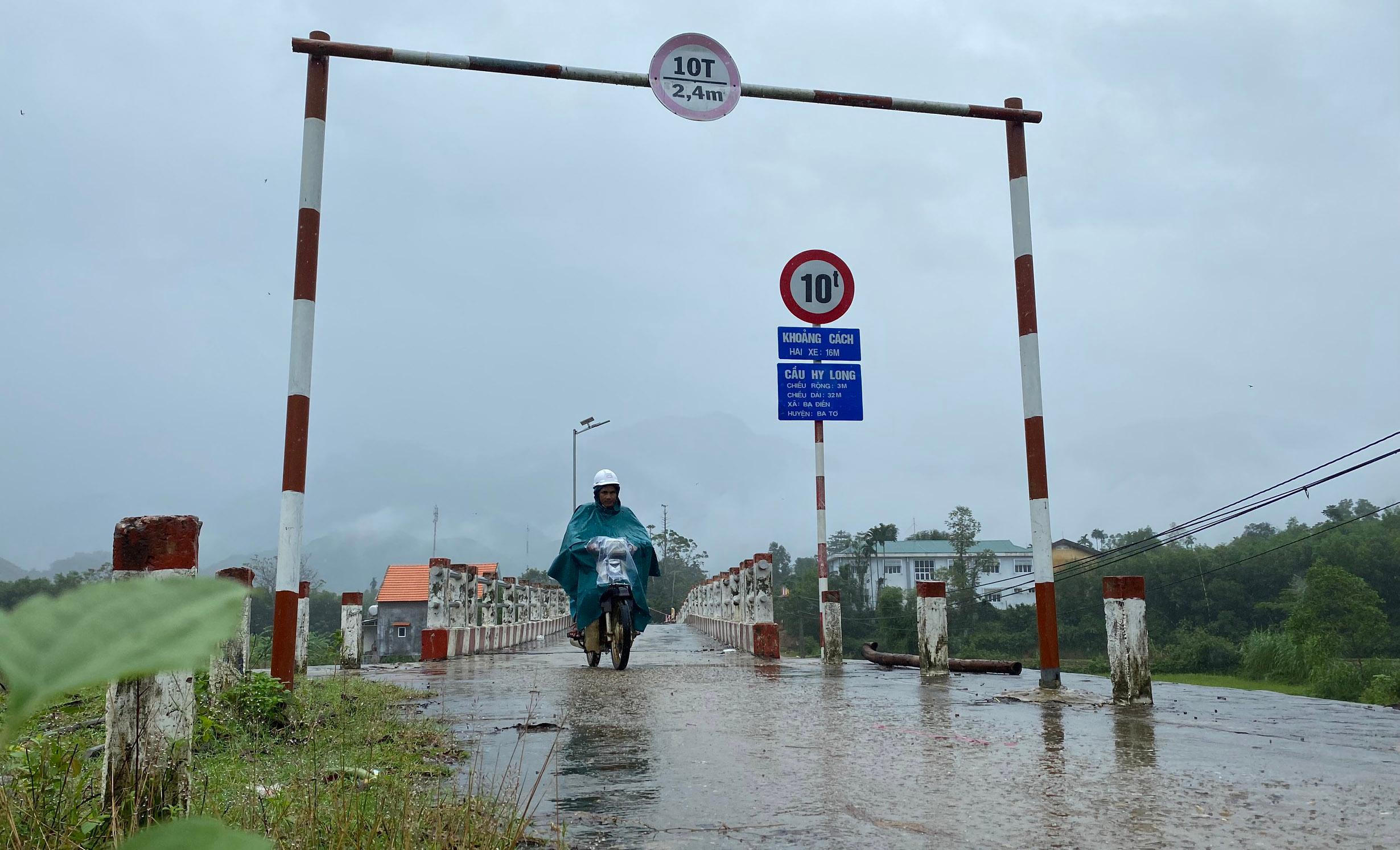 Người dân đi xe máy tạm qua cầu Hy Long phía bên trên đường tràn bị sụt lún hư hỏng. |