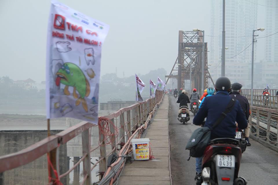 | Tại Cầu Long Biên những chiếc thùng, chiếc tải được nhóm bạn trẻ để ở ven thành cầu để người dân thả cá xong có thể bỏ túi nilon vào đó. |