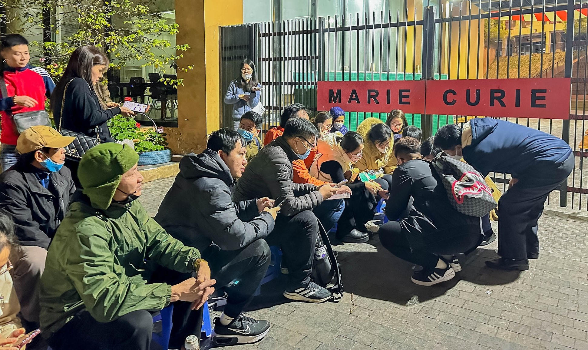 Theo thông báo từ Trường Marie Curie, hôm nay, ngày 25/2, trường mới phát hành hồ sơ tuyển sinh vào lớp 1 nhưng từ tối 24/2, đông đảo phụ huynh đã ở cổng trường xếp hàng chờ.