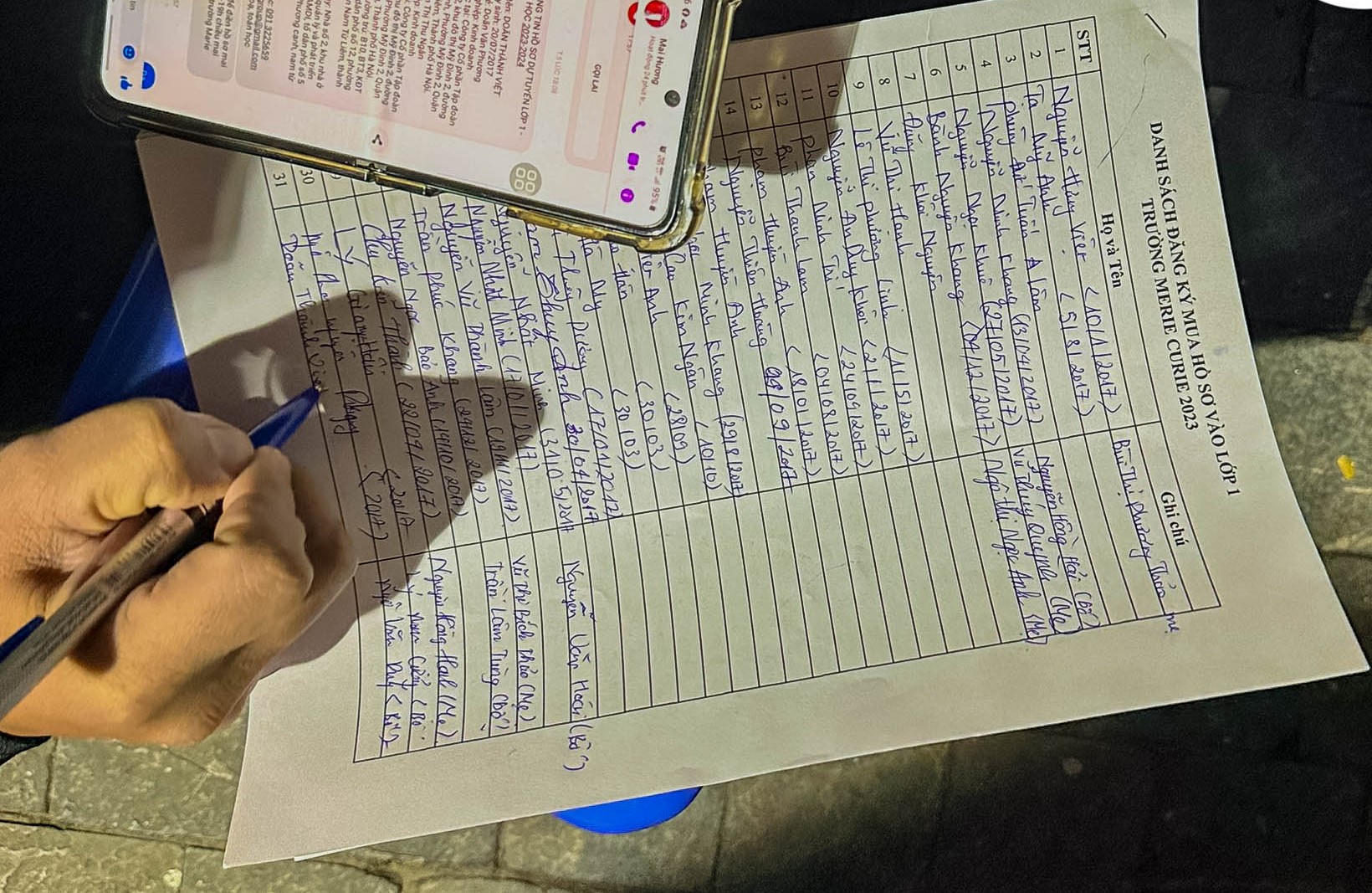 Trước tình trạng phụ huynh xếp hàng mua hồ sơ quá đông, nhà trường quyết định phát hành hồ sơ từ 23h ngày 24/2, thay vì 8h sáng 25/2 như đã định. Tổng cả hai cơ sở là 720 hồ sơ.