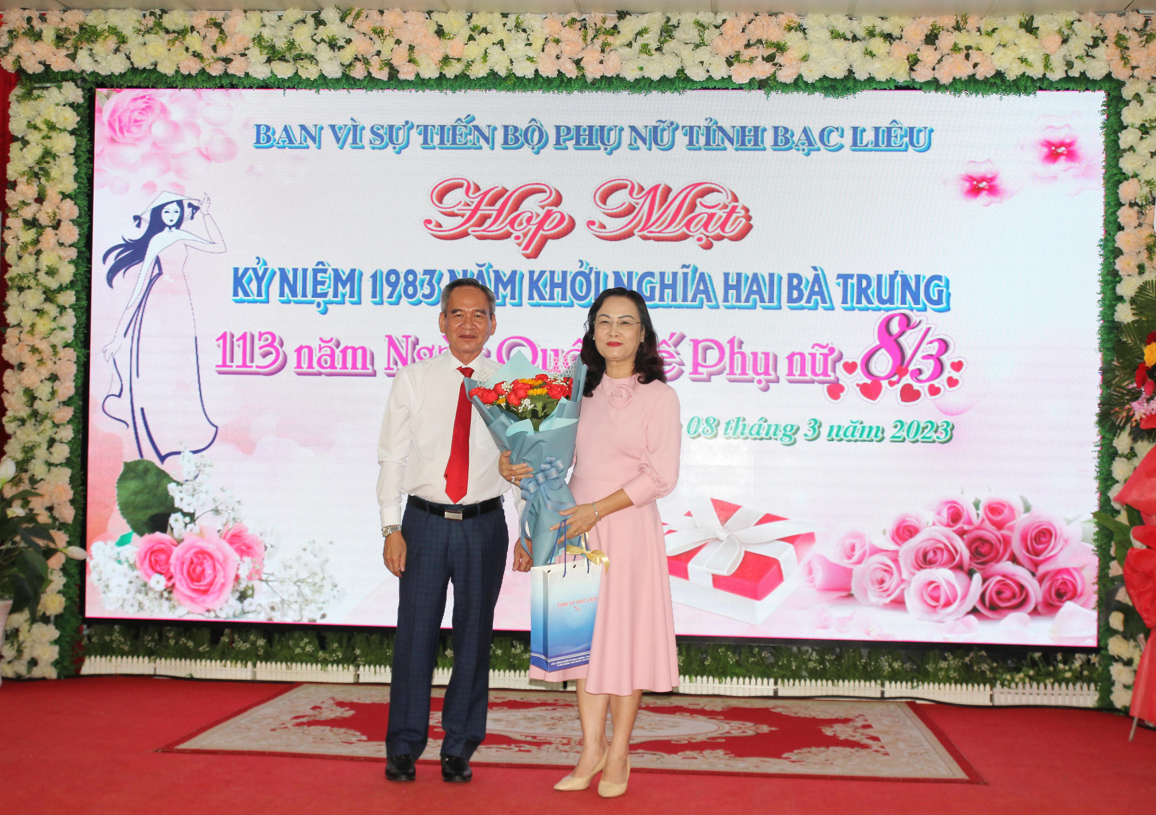 Tại buổi họp mặt, bà Trương Hồng Trang – Chủ tịch Hội LHPN tỉnh Bạc Liêu phát biểu ôn lại ý nghĩa lịch sử 113 năm Ngày Quốc tế Phụ nữ 8/3, 1983 năm Khởi nghĩa Hai Bà Trưng. Chúng ta tự hào nhắc đến cuộc khởi nghĩa của Hai Bà Trưng chống quân Đông Hán. Dưới sự lãnh đạo của Đảng và Bác Hồ kính yêu, Phụ nữ Việt Nam nói chung, các tầng lớp Phụ nữ Bạc Liêu nói riêng đã có những đóng góp xứng đáng vào công cuộc giải phóng đất nước: các phong trào Ba đảm đang, Phụ nữ 5 tốt, Đội quân tóc dài… đã để lại những dấu ấn không phai mờ trong lịch sử, làm rạng danh thêm truyền thống anh hùng của quê hương, đất nước, xứng đáng với lời khen ngợi của Bác Hồ “Non sông gấm vóc Việt Nam do Phụ nữ ta, trẻ cũng như già ra sức dệt thêu mà thêm tốt đẹp, rực rỡ".
