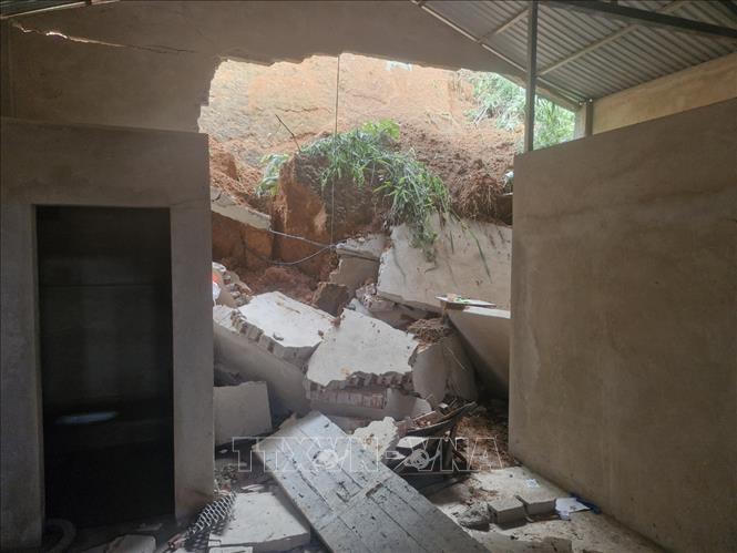 Mưa lớn gây sạt lở đất làm đổ tường nhà của hộ dân ở xã Búng Lao, huyện Mường Ảng. (Ảnh: TTXVN) |