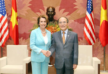 Chủ tịch Quốc hội Nguyễn Sinh Hùng - Chủ tịch Đại hội đồng IPU 132 vui mừng chào đón bà Nancy Pelosy và Đoàn đại biểu nghị viện Hoa Kỳ sang Việt Nam tham dự Đại hội đồng IPU 132, đúng dịp hai nước đang tích cực kỷ niệm 20 năm bình thường hóa quan hệ.