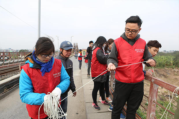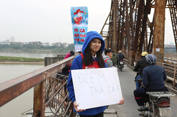 Ngày 8/2 (tức 23 tháng Chạp âm lịch), trên cầu Long Biên, Hà Nội,rất đông các bạn tình nguyên viên cầm Những tấm biển mang thông điệp: "Thả cá đừng thả túi nilon" đứng dọc đường cầu Long Biên.