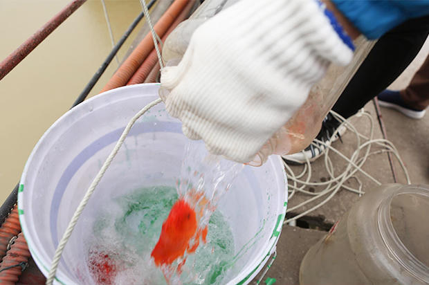 Cá chép được thả xuống sông bằng xô tránh việc thả cá từ trên cao xuống dẫn đến chết cá.