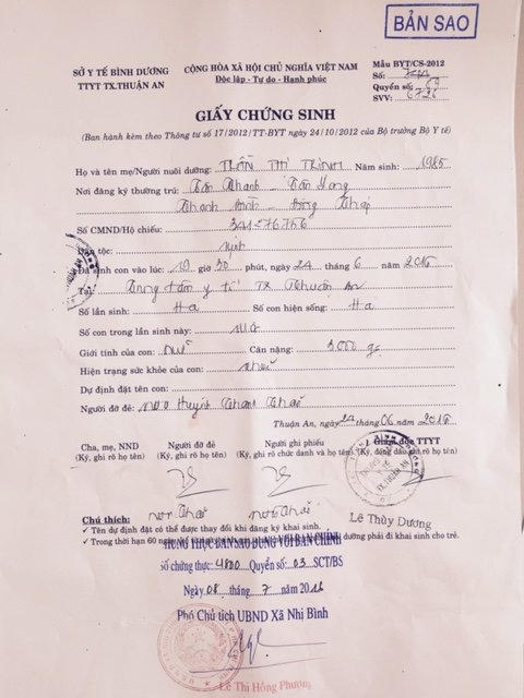Bản sao giấy chứng sinh con của Trinh tại Trung tâm y tế thị xã Thuận an, Bình Dương |