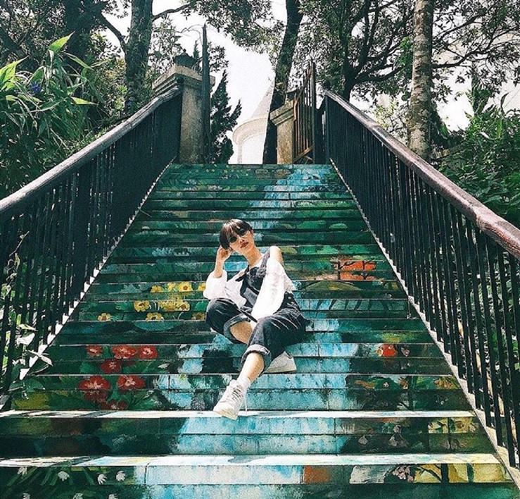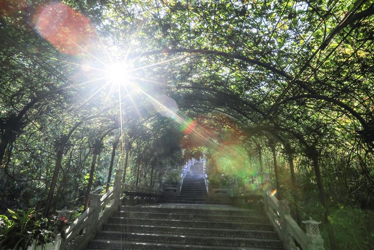Lối lối cầu thang đá dẫn lên khu tâm linh rợp bóng xanh bởi những vòm cây. Nắng xuyên qua kẽ lá, con đường nhỏ hun hút sâu dẫn đến chốn thiền dễ khiến ta quên đi hết những xô bồ, để quay trở về với an yên, thiền định.