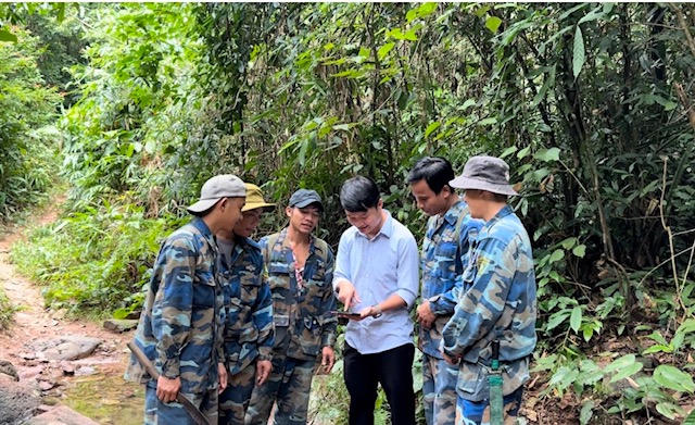 Phó Giám đốc Quỹ Bảo vệ và Phát triển rừng tỉnh Thừa Thiên Huế Trần Quốc Cảnh (thứ 3 từ phải sang) cùng cộng đồng tuần tra, bảo vệ rừng. (Ảnh: PV) |