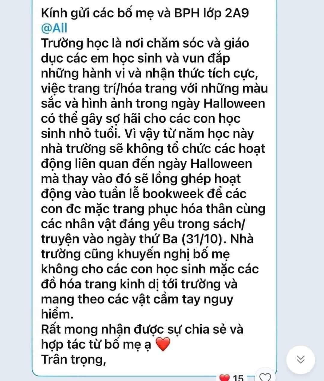 Trước đó, trong group lớp của một trường tiểu học, tin nhắn đề xuất của nhà trường về việc không tổ chức các hoạt động liên quan đến ngày Halloween nhận được nhiều sự đồng tình của các bậc phụ huynh.