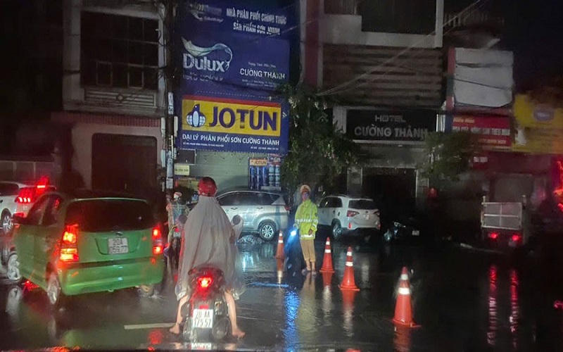 Cảnh sát giao thông cũng có mặt tại nhiều tuyến đường để phân luồng, cảnh báo các khu vực nước sâu nguy hiểm, hỗ trợ phương tiện đến nơi an toàn.