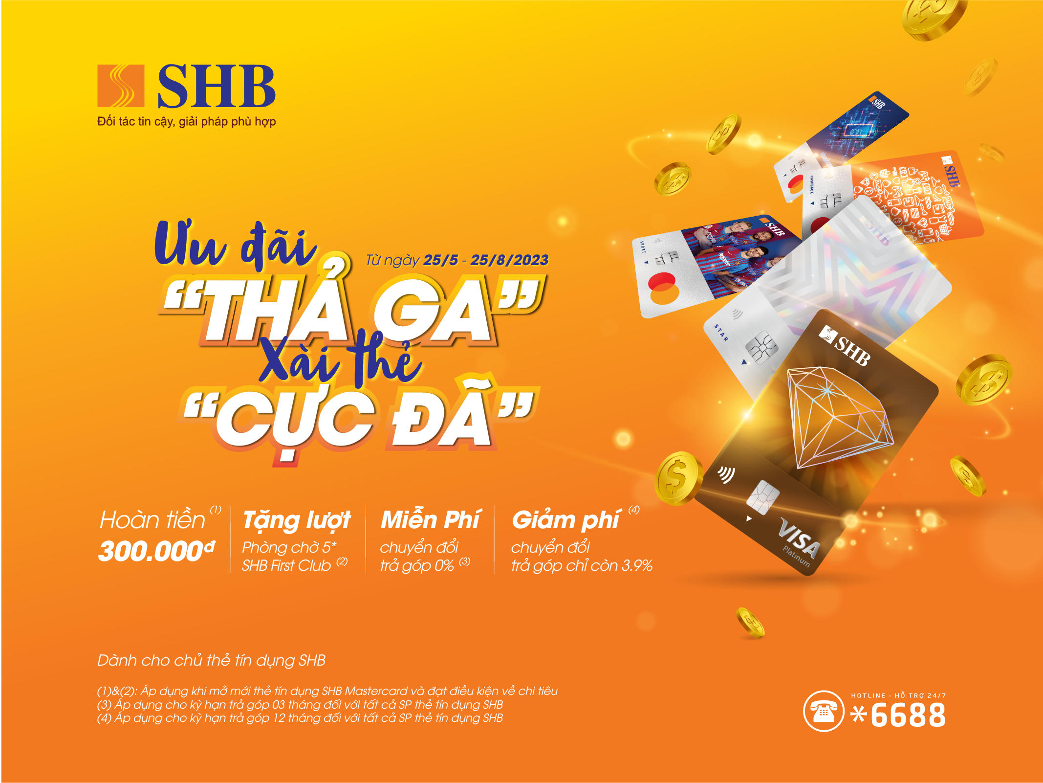 Chương trình khuyến mại diễn ra từ ngày 25/5 – 25/8/2023 trên toàn hệ thống SHB, bao gồm thẻ chính phát hành mới tại quầy và qua App SHB Mobile, không bao gồm thẻ phát hành lại/gia hạn và thẻ chuyển đổi.