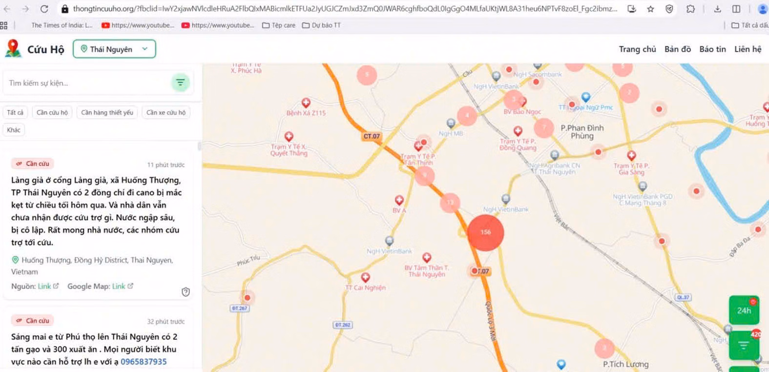 Bên cạnh các hoạt động hỗ trợ trực tiếp, nhiều bạn trẻ đam mê công nghệ còn sử dụng tài năng của mình để lan tỏa tinh thần nhân ái của cộng đồng trong những lúc khó khăn. Một trong số đó là bản đồ cứu hộ trực tuyến thongtincuuho.org do hai kỹ sư trẻ xây dựng. Vốn là những người phát triển dự án vntraffic.app - nền tảng theo dõi giao thông theo thời gian thực, song khi chứng kiến ảnh hưởng của hoàn lưu bão Matmo gây mưa lớn kéo dài, ngập lụt nghiêm trọng tại nhiều khu vực ở Thái Nguyên, hai kỹ sư trẻ đã nhanh chóng chuyển hướng.