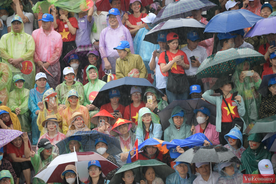 Người dân trên khán đài phấn khởi, háo hức chờ đến giờ khai mạc buổi lễ mặc dù có mưa lớn (Ảnh: VnEconomy)