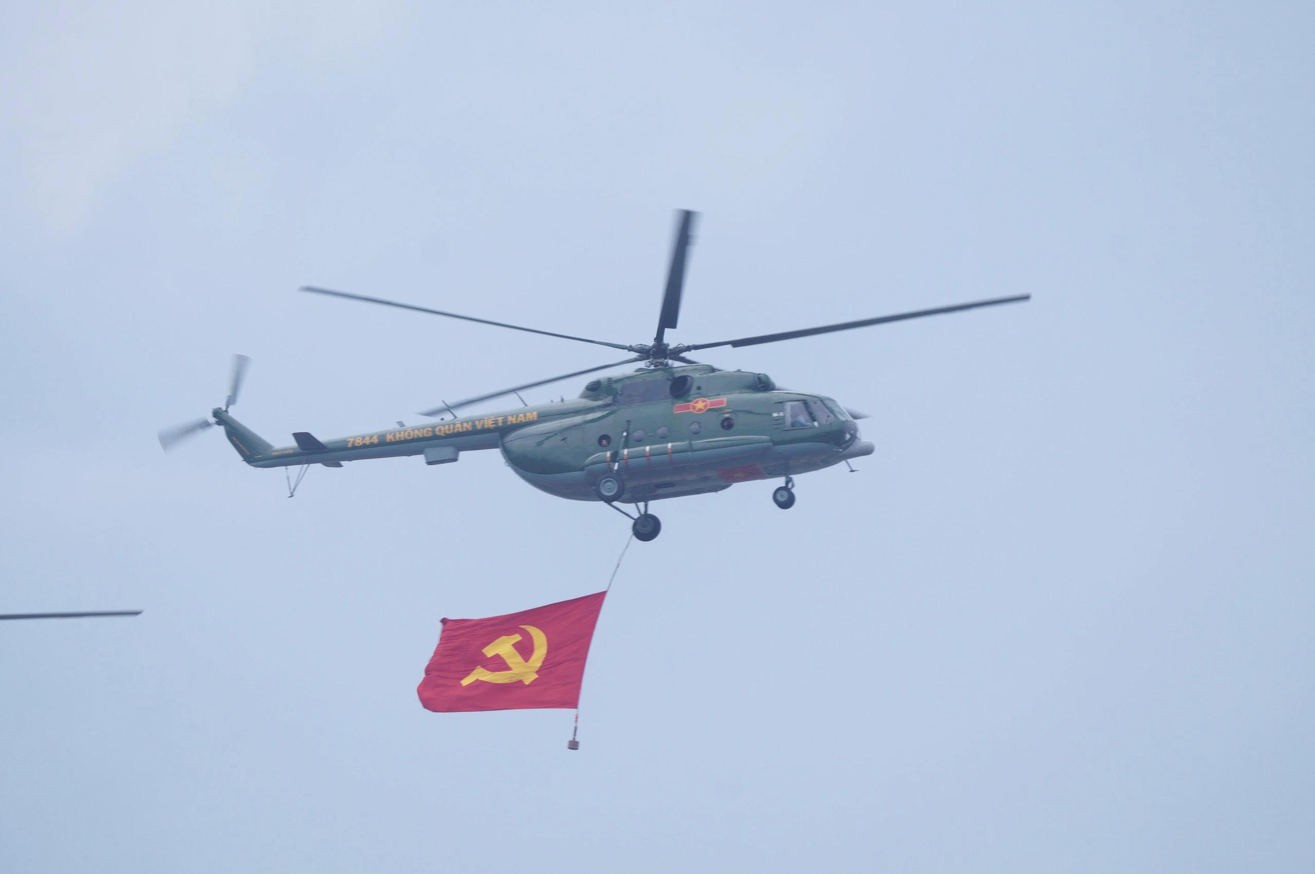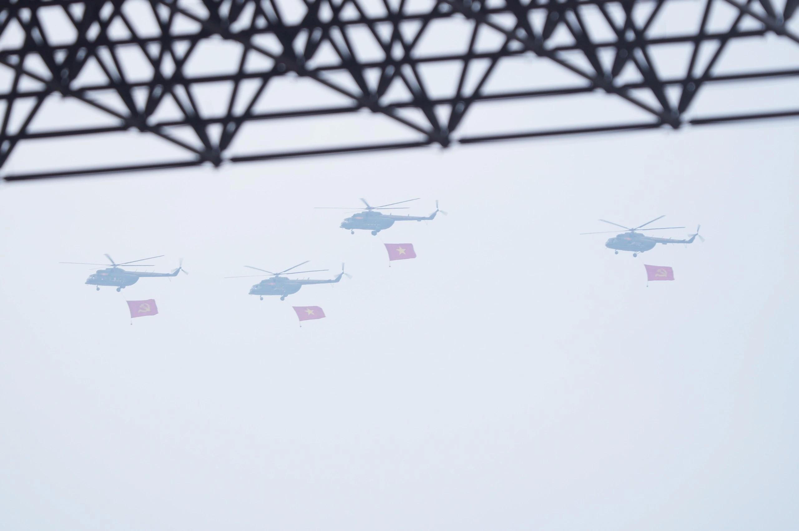 Các biên đội trực thăng vũ trang thuộc Quân chủng Phòng không - Không quân, Quân đội nhân dân Việt Nam mang theo cờ Đảng, cờ Tổ quốc Việt Nam diễu hành tiến qua sân vận động Điện Biên. Lần đầu trực thăng bay biểu diễn trở thành điểm nhấn của lễ diễu binh diễu hành. (Ảnh: Dân Việt)
