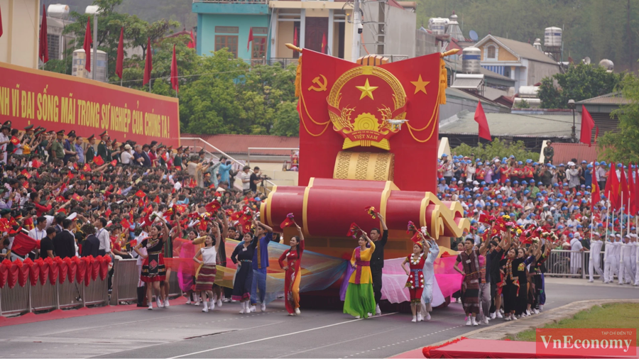 Ngay sau lễ mít tinh là lễ diễu binh, diễu hành kỷ niệm 70 năm Chiến thắng Điện Biên Phủ. Xe rước Quốc huy và xe rước ảnh chân dung Chủ tịch Hồ Chí Minh tiến qua lễ đài. (Ảnh: VnEconomy)