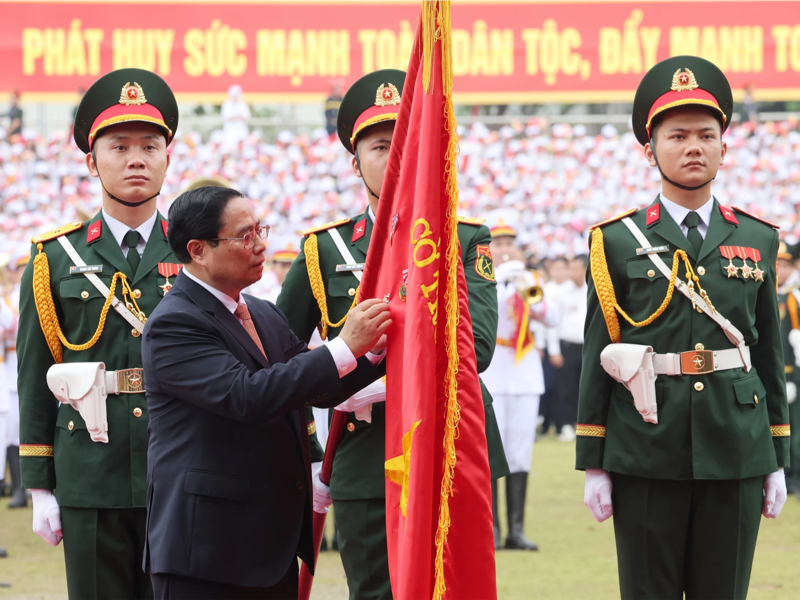 Thay mặt lãnh đạo Đảng, Nhà nước, Thủ tướng Phạm Minh Chính đã trao và gắn Huân chương Độc lập Hạng nhất cho Đảng bộ, chính quyền và nhân dân các dân tộc tỉnh Điện Biên. (Ảnh: VnEconomy)
