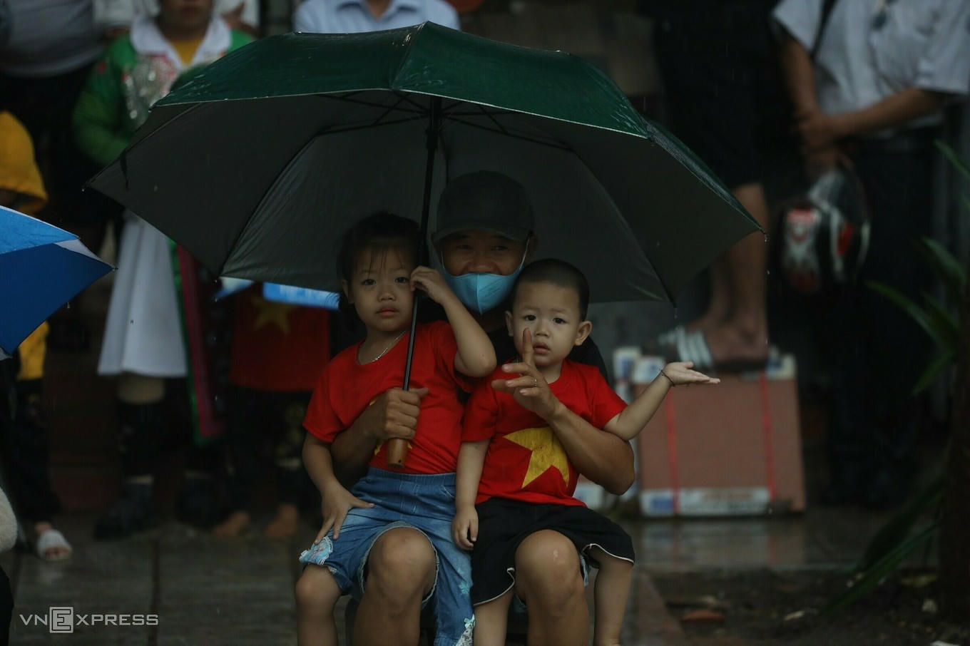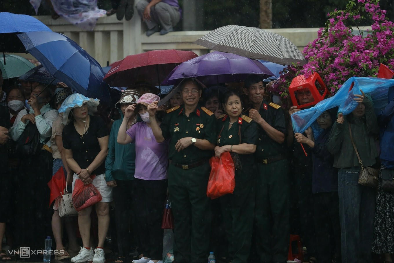 Trẻ em, cựu chiến binh đội mưa xem diễu binh. Ảnh: Phạm Chiểu - VNExpress