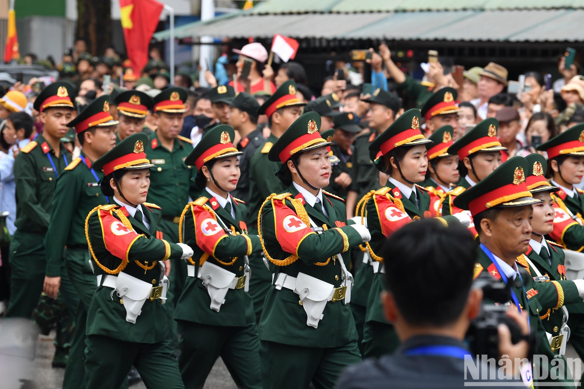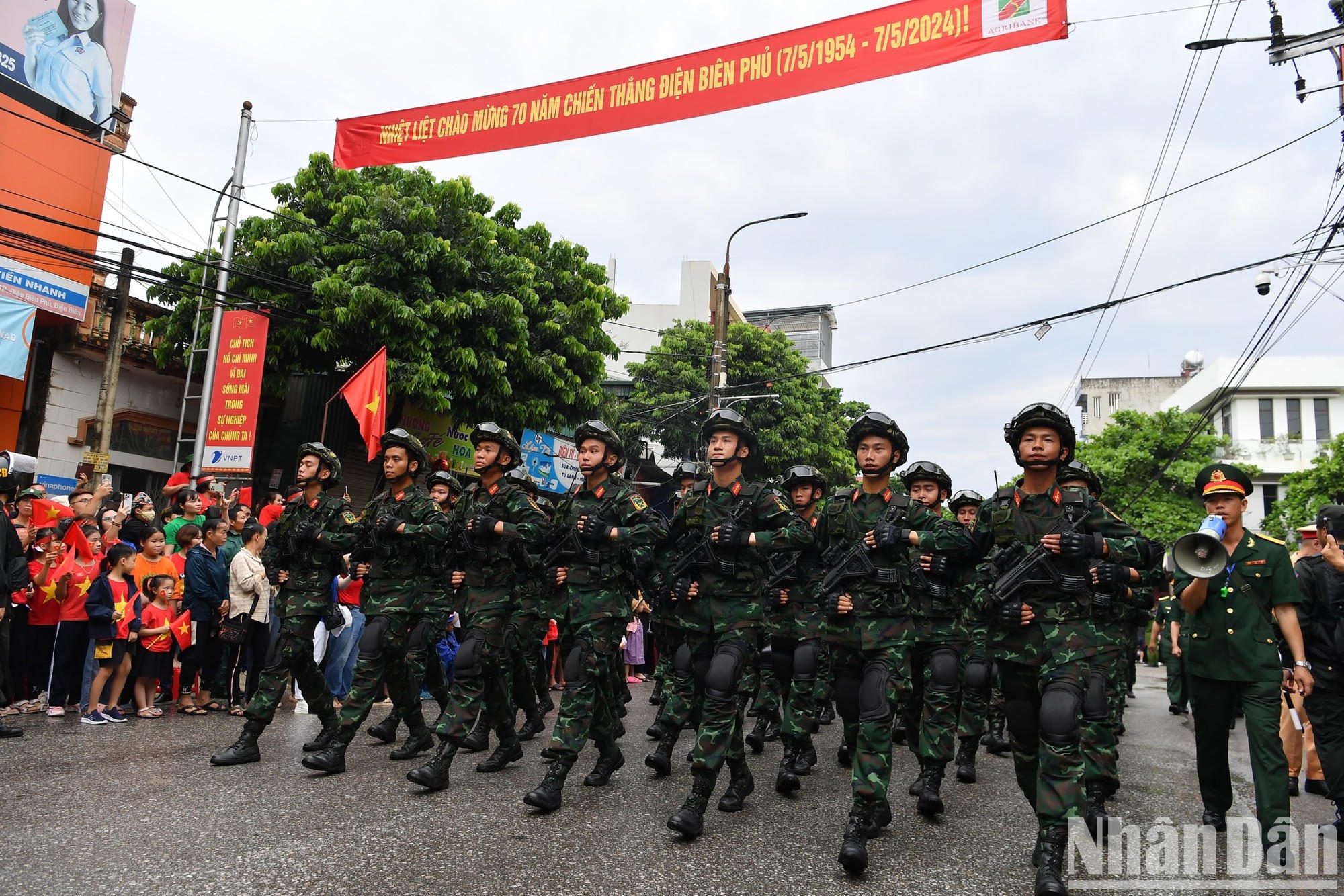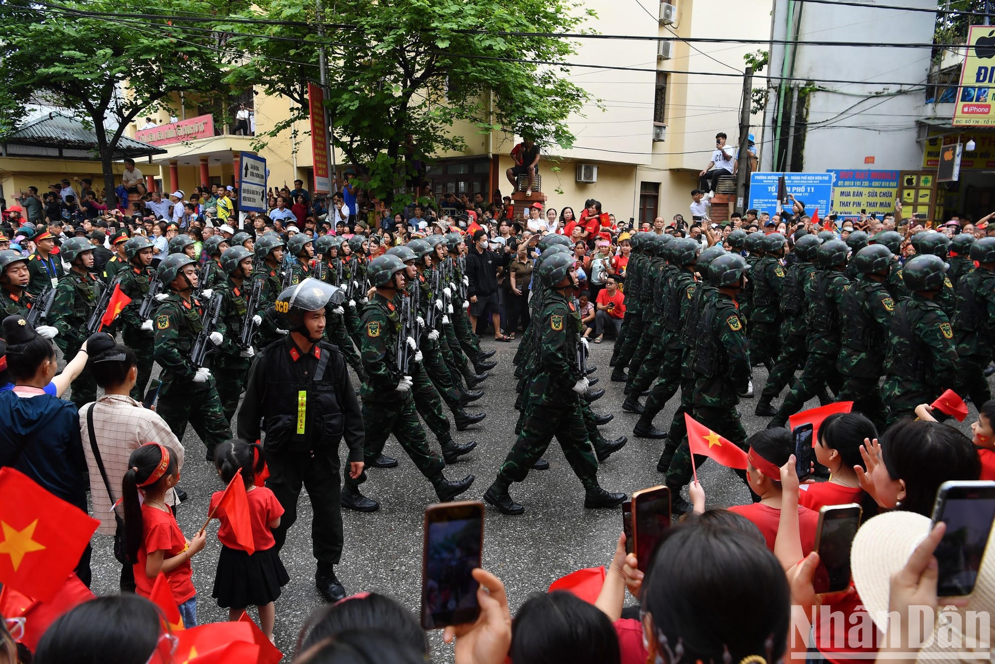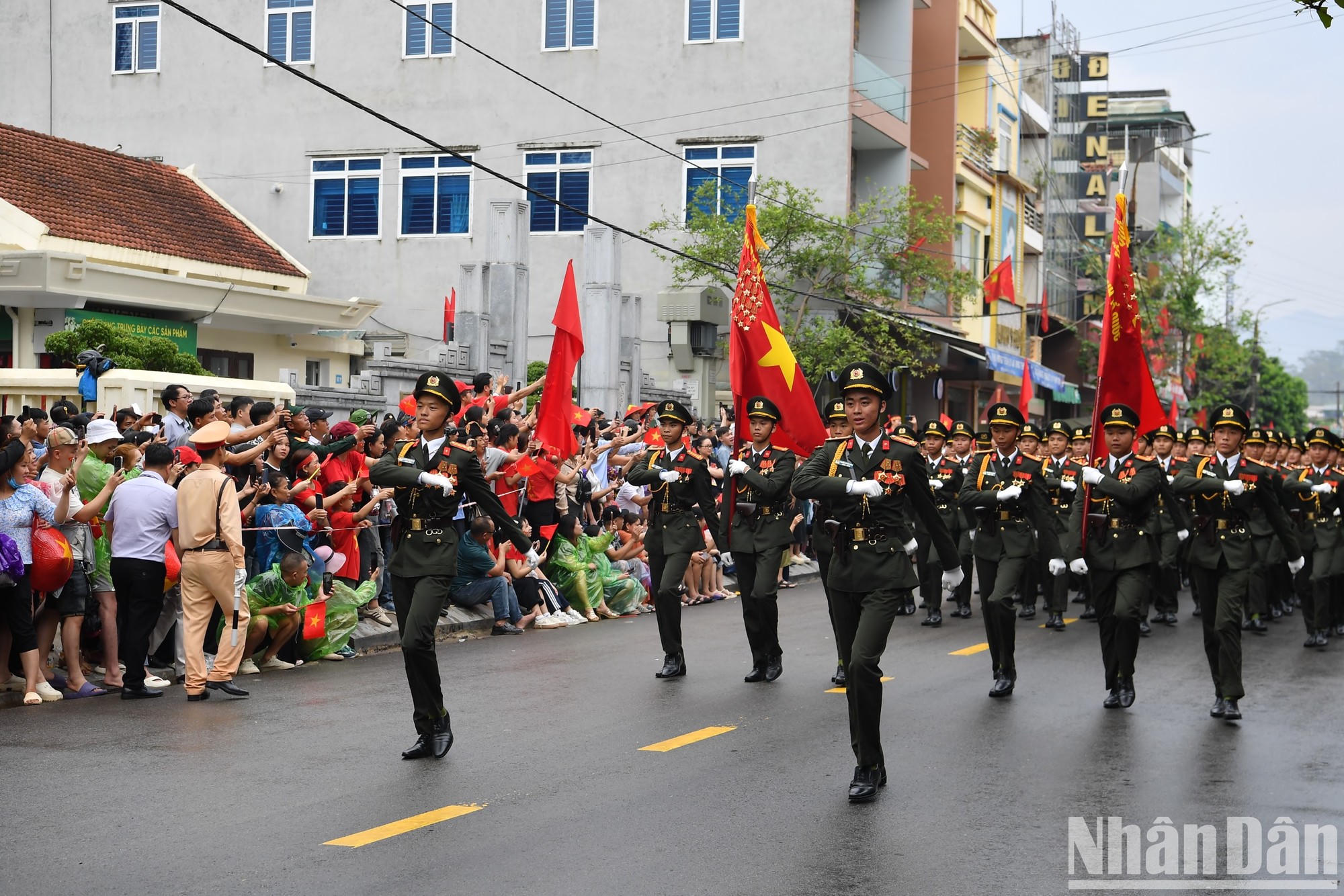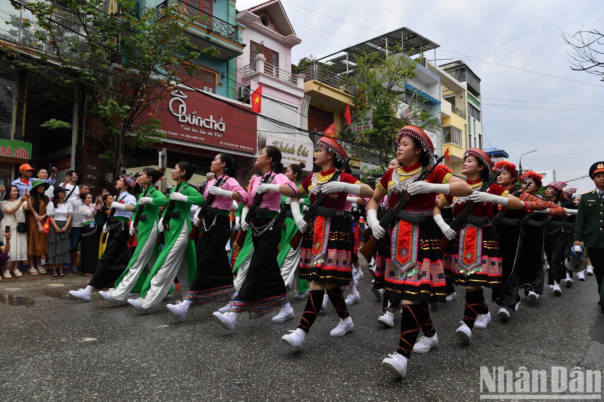 Các khối diễu binh, diễu hành lần lượt đi qua các tuyến phố, tạo nên không khí đặc biệt cho thành phố Điện Biên Phủ (Ảnh: Nhân Dân)