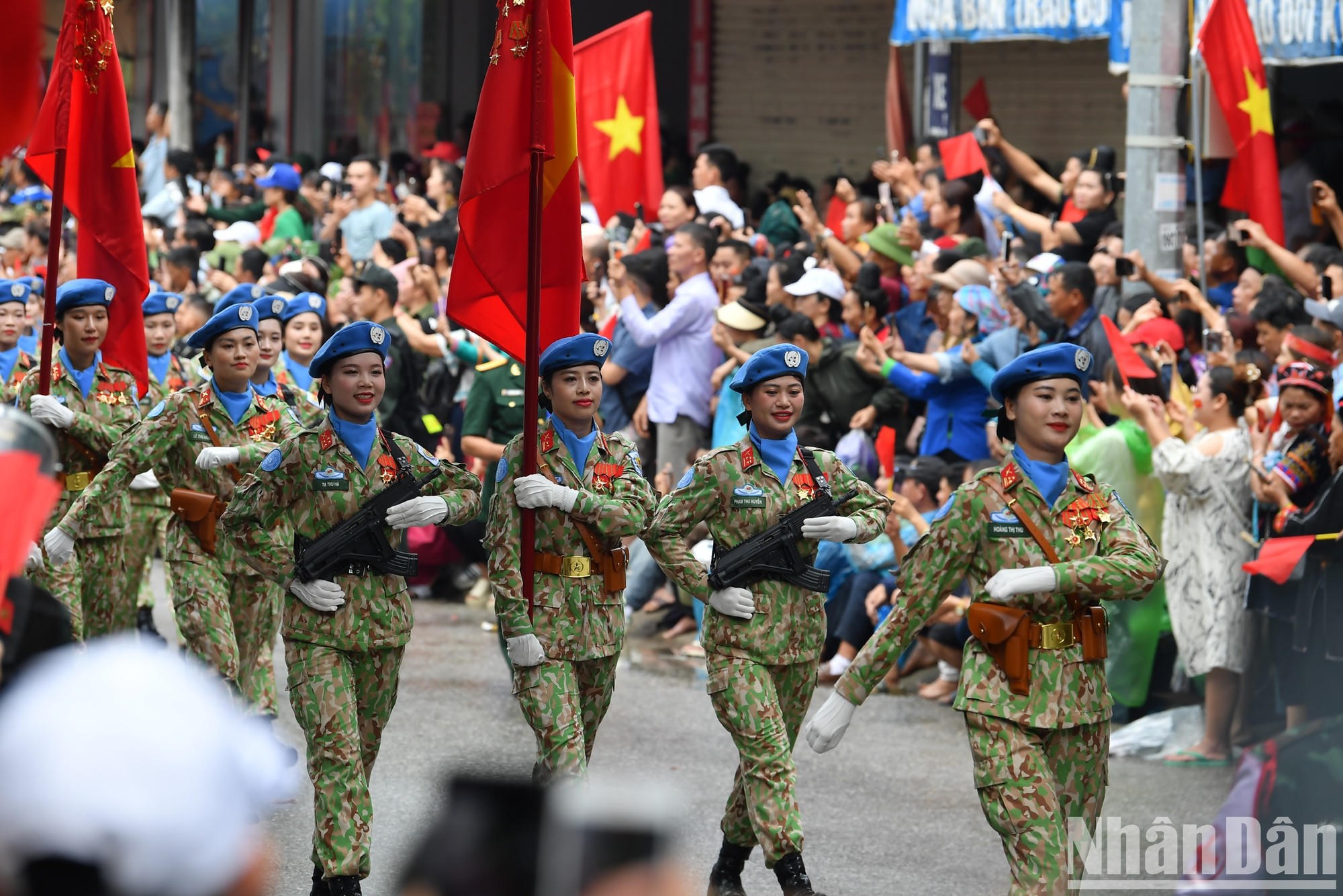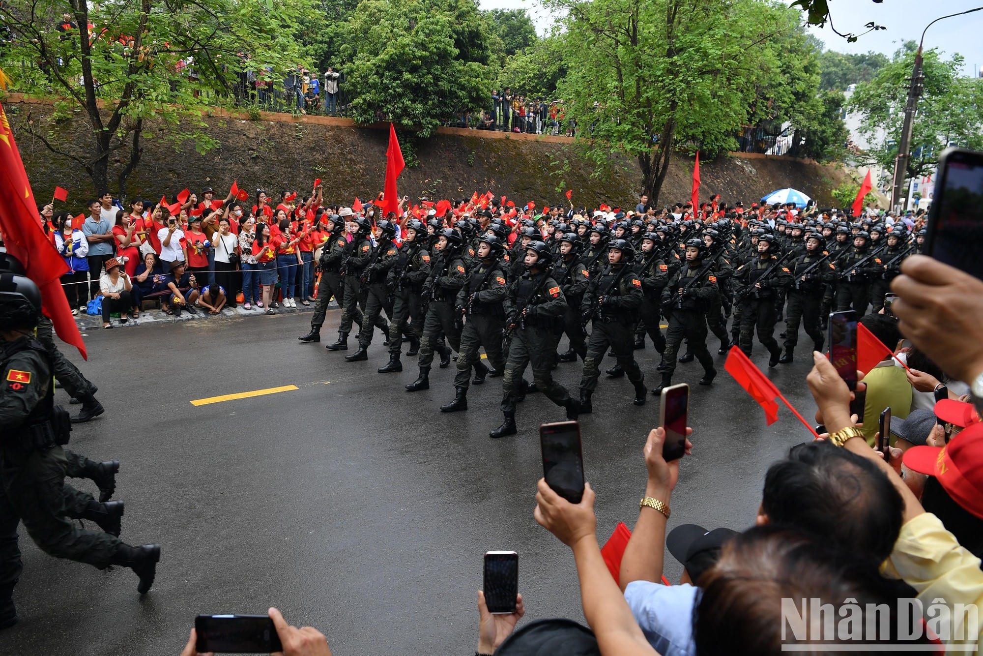 Sau khi kết thúc phần diễu binh, diễu hành tại sân vận động tỉnh Điện Biên, các lực lượng quân đội, dân quân tự vệ và công an, các ban ngành, đoàn thể xã hội... qua các tuyến phố chính (Ảnh: Nhân Dân)