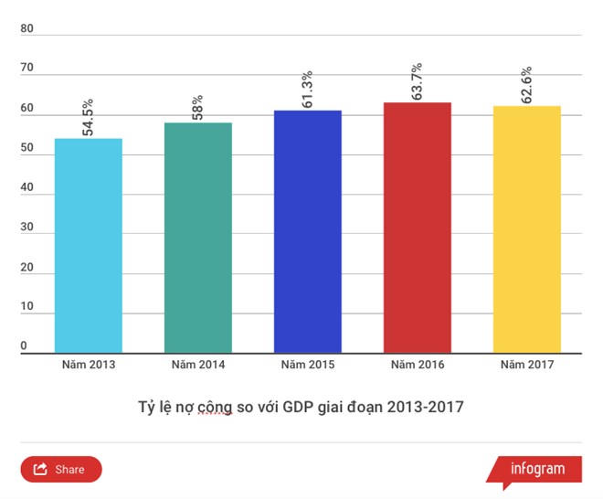 Thừa nhận áp lực trả nợ thời gian qua là lớn, Bộ trưởng Đinh Tiến Dũng thống kê, giai đoạn 2011-2015, nợ công tăng bình quân một năm 18,4%. Tuy nhiên, đến năm 2016 và năm 2017, theo Bộ trưởng, tỷ lệ này đang chậm lại, năm 2016 khoảng 15% và năm 2017 là 9%. Báo cáo ngành tài chính cho thấy, tỷ lệ nợ công trên GDP năm 2016 khoảng 63,7% và dự kiến đạt 62,6% năm 2017.