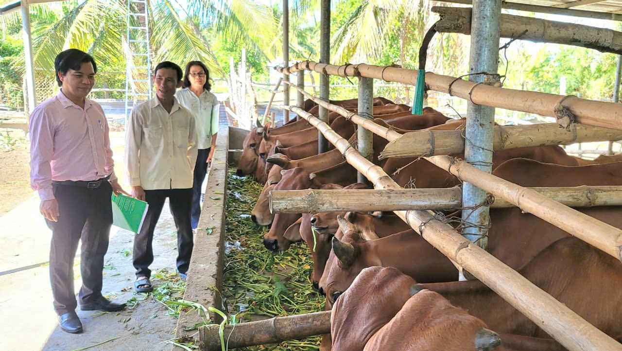 Cán bộ NHCSXH thăm mô hình của người dân. |