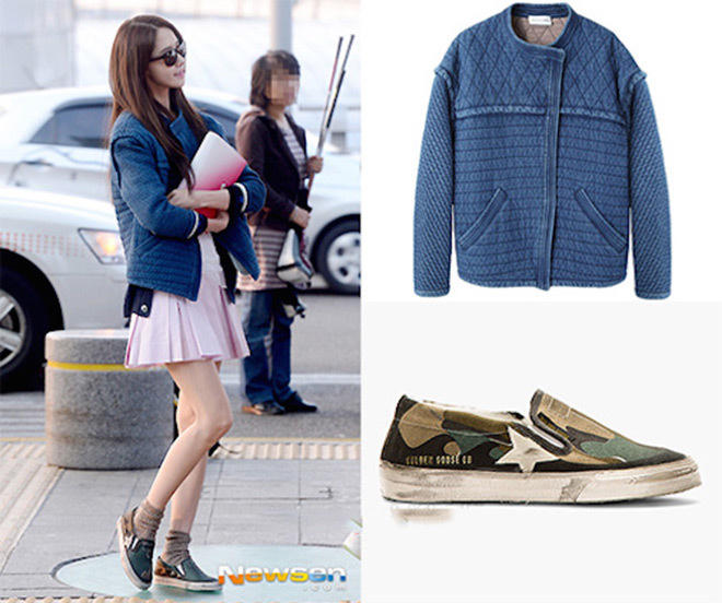 Yoon Ah (ban nhạc SNSD) cũng bị mốt giày này chinh phục. Cô chọn một đôi giày lười thể thao rằn ri phối cùng chân váy xếp ly phong cách nữ sinh.