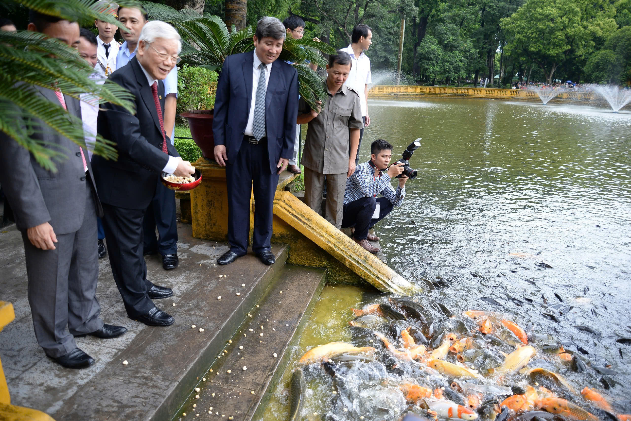 Cố Tổng Bí thư Nguyễn Phú Trọng cho cá ăn tại Ao cá Bác Hồ. |