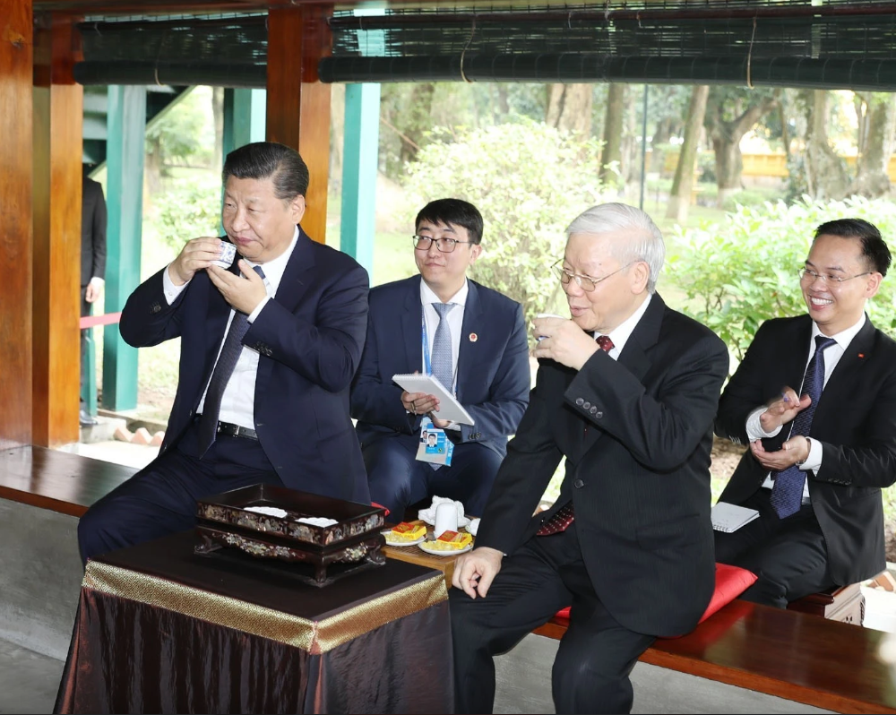 Cố Tổng Bí thư Nguyễn Phú Trọng cùng Tổng Bí thư, Chủ tịch nước Trung Quốc Tập Cận Bình thưởng thức trà tại Nhà sàn Bác Hồ, năm 2017. |