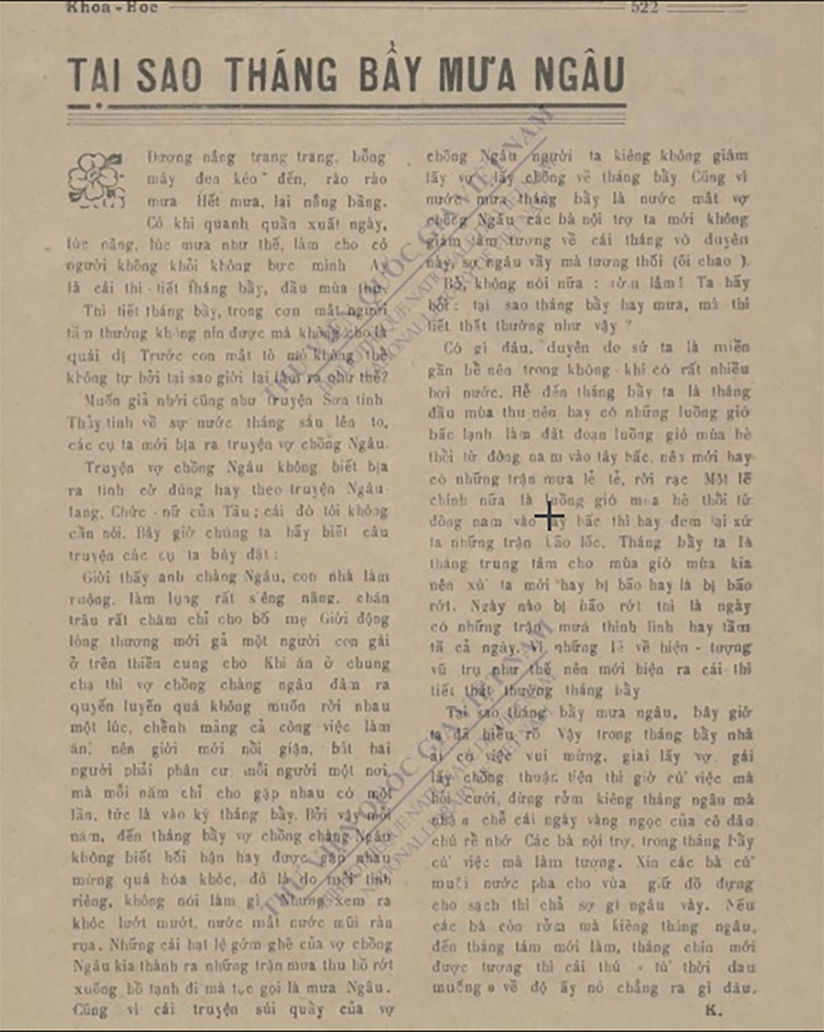 Sự tích về vợ chồng Ngâu đăng trên báo Khoa học năm 1936. (Ảnh: Thư viện Quốc gia) |