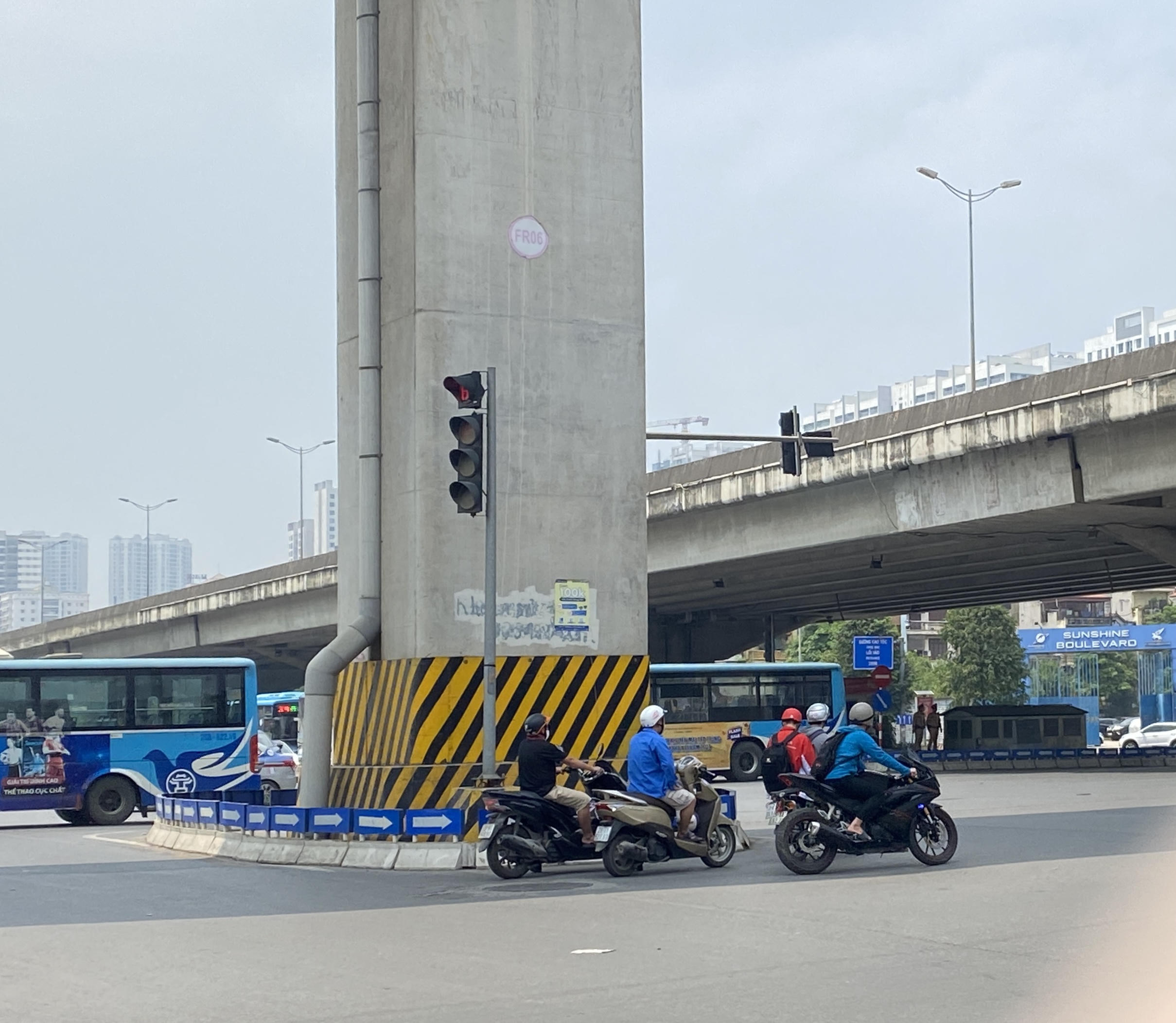 Nhiều người nép vào bóng cây chờ đèn đỏ.