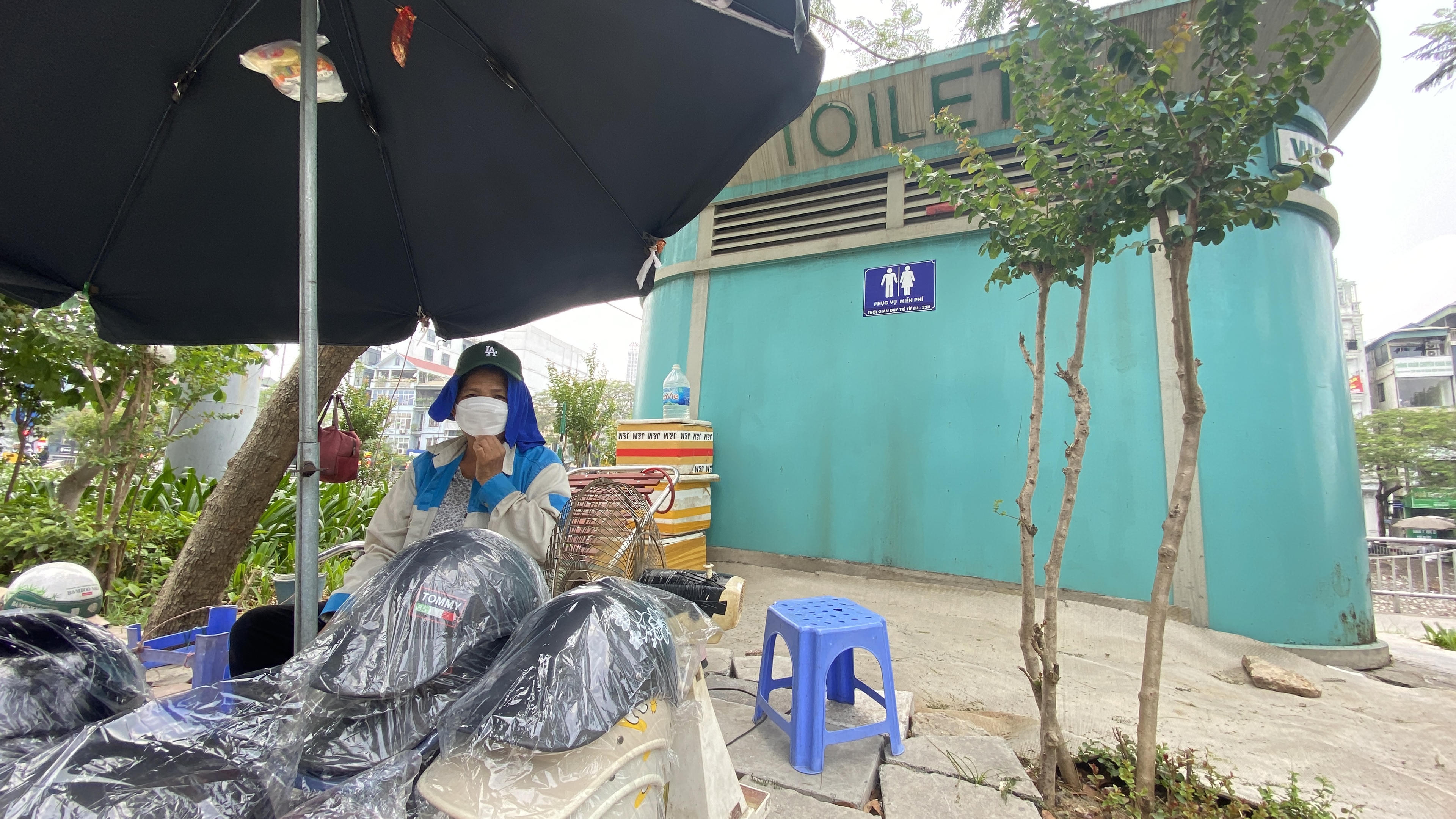 Bà Triệu Loan nhân viên của một công ty môi trường ở Hà Nội có nhiệm vụ trông nhà vệ sinh công cộng. "Tôi làm việc từ 6h sáng đến 22h, ngày nắng cũng như ngày mưa đều phải trực. Mấy hôm nay nắng nóng quá, tôi phải trực ở đây cảm thấy rất khó thở".