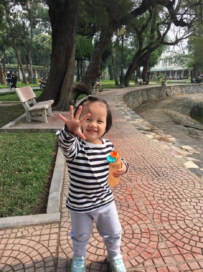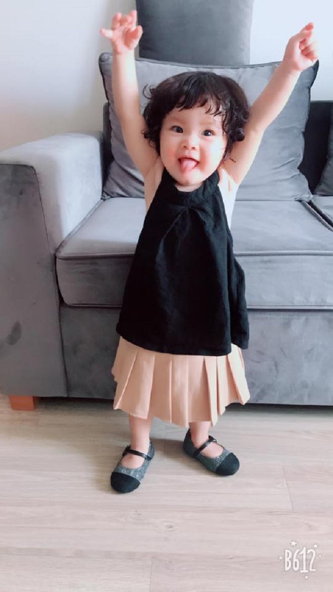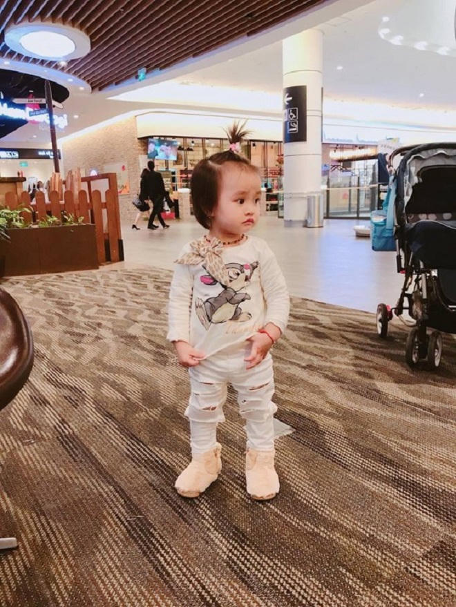 Con gái Hải Băng là một trong những nhóc tỳ nhà sao Việt sành điệu nhất tuần qua. Trang phục của bé gồm áo cổ yếm, chân váy xếp ly và đi giày búp bê