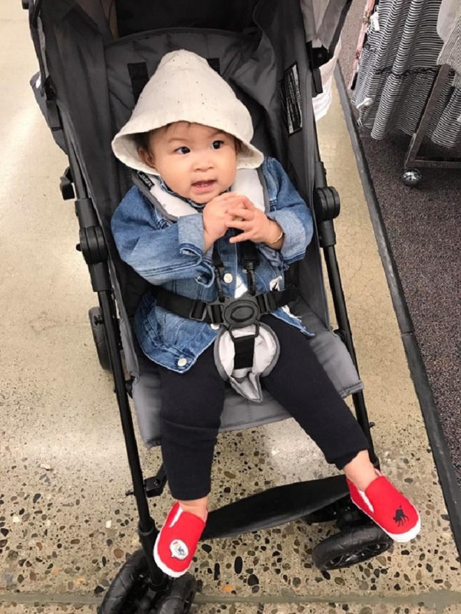 Khi thời tiết ấm hơn, MC Minh Trang cho con gái diện áo phông dài tay mix với quần jean và đi giày.