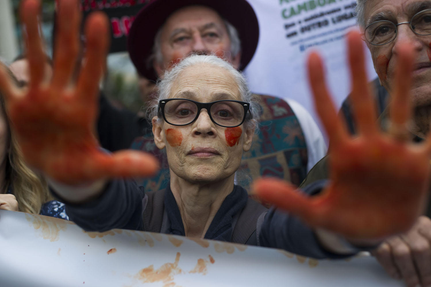 Trong một cuộc biểu tình bảo vệ Amazon tại Rio de Janeiro khi đám cháy đang xảy ra dữ dội, nữ diễn viên người Brazil Sonia Braga đưa hai bàn tay được sơn màu đỏ tượng trưng cho máu ra trước ống kính