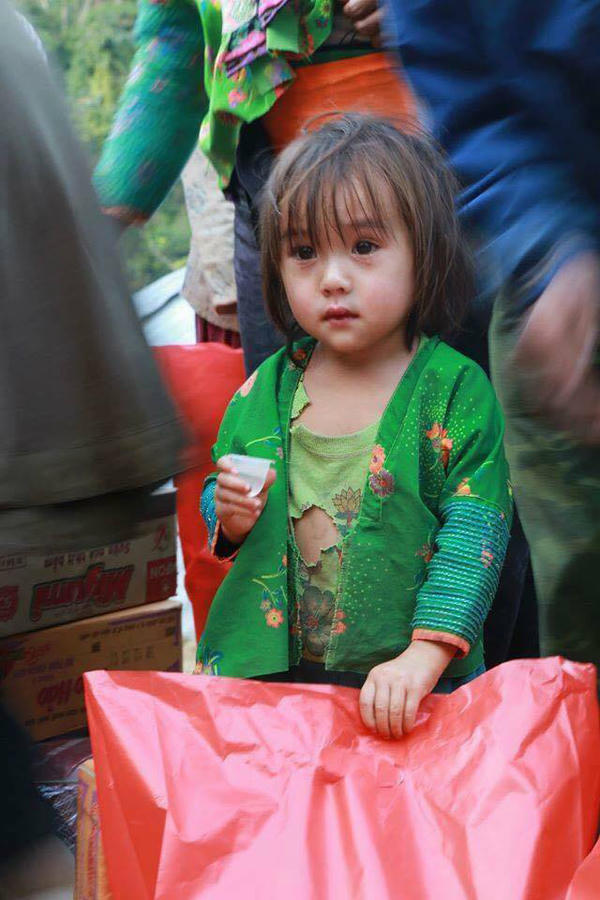 Hình ảnh bé gái chừng 3 - 4 tuổi mặc chiếc áo rách nham nhở, đôi mắt mở to đượm buồn, tay cầm túi quà từ thiện đang khiến cư dân mạng nhói lòng.