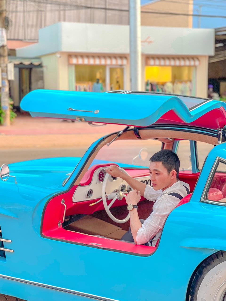 Phần cửa xe có trọng lượng lên tới 120 kg. Do đó, anh Đại đã sử dụng một thiết bị trợ lực giúp nâng đỡ phần cửa xe khi mở lên. Nhóm anh Đại đặc biệt quan tâm tới chi tiết cửa xe đặc trưng của Mercedes 300 SL với mong muốn thiết kế phần cửa sao cho giống nguyên mẫu nhất có thể, ngay cả ở những chi tiết nhỏ như kính hay tay nắm.