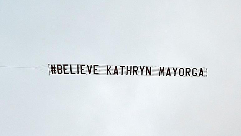 Biểu ngữ có nội dung "Hãy tin Kathryn Mayorga" đã được bay trên sân vận động Old Trafford của Manchester United trong trận đấu đầu tiên CR7 quay lại MU sau 12 năm. |