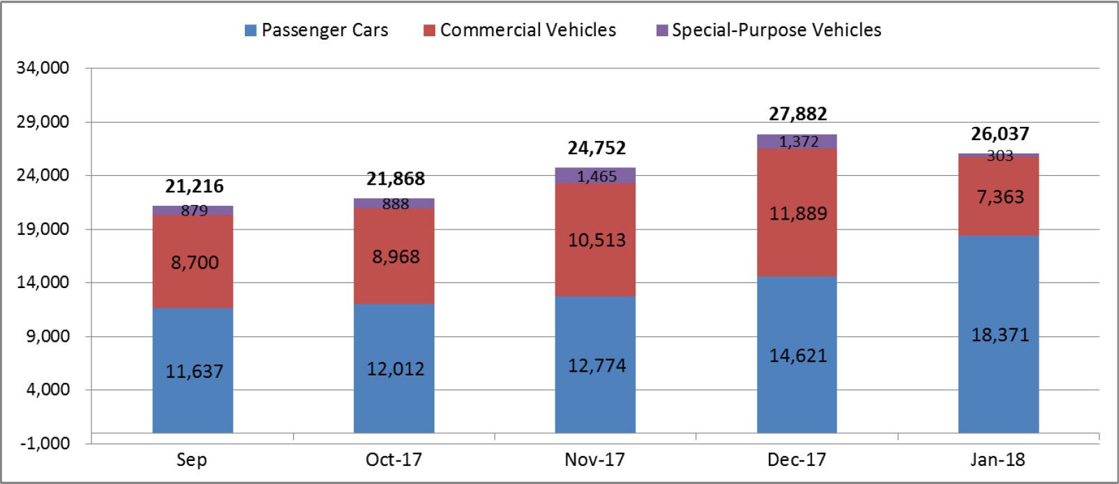 Báo cáo của Hiệp hội các Nhà sản xuất ôtô Việt Nam (VAMA) cho biết, chỉ có 26.037 ô tô được bán ra trong tháng 1/2018, giảm 7% so với tháng 12/2017.