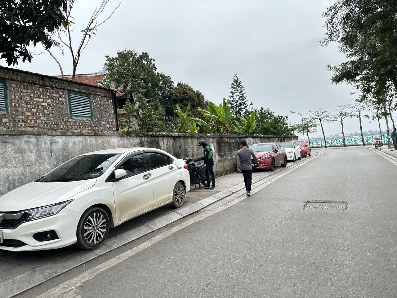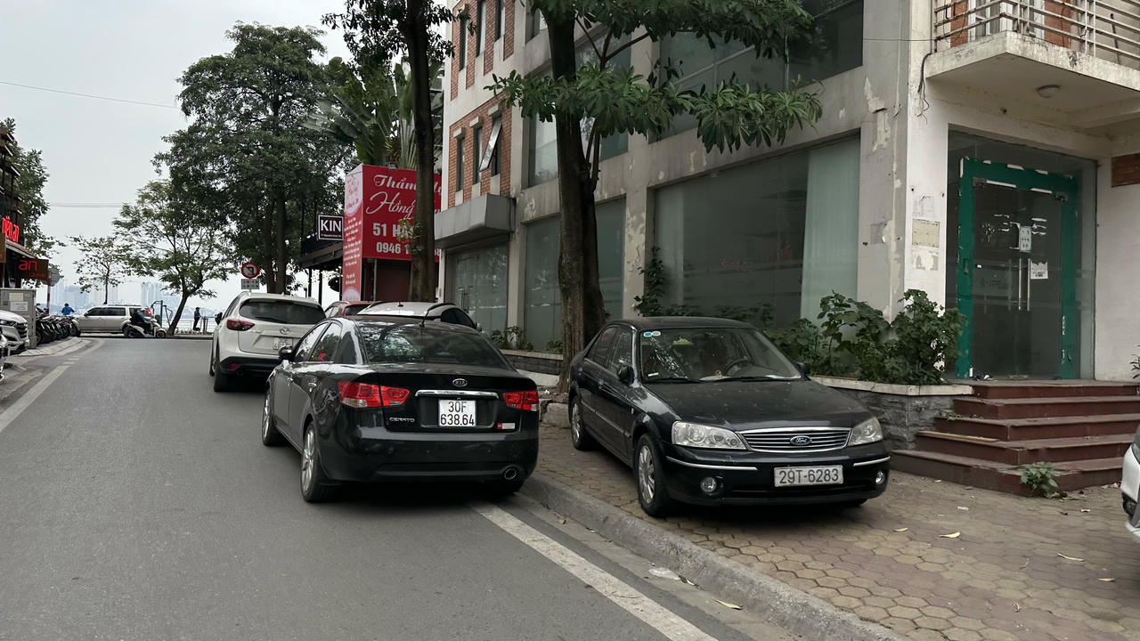 Nhiều chiếc ôtô "chễm chệ" nằm trên vỉa hè của phố Vệ Hồ. |