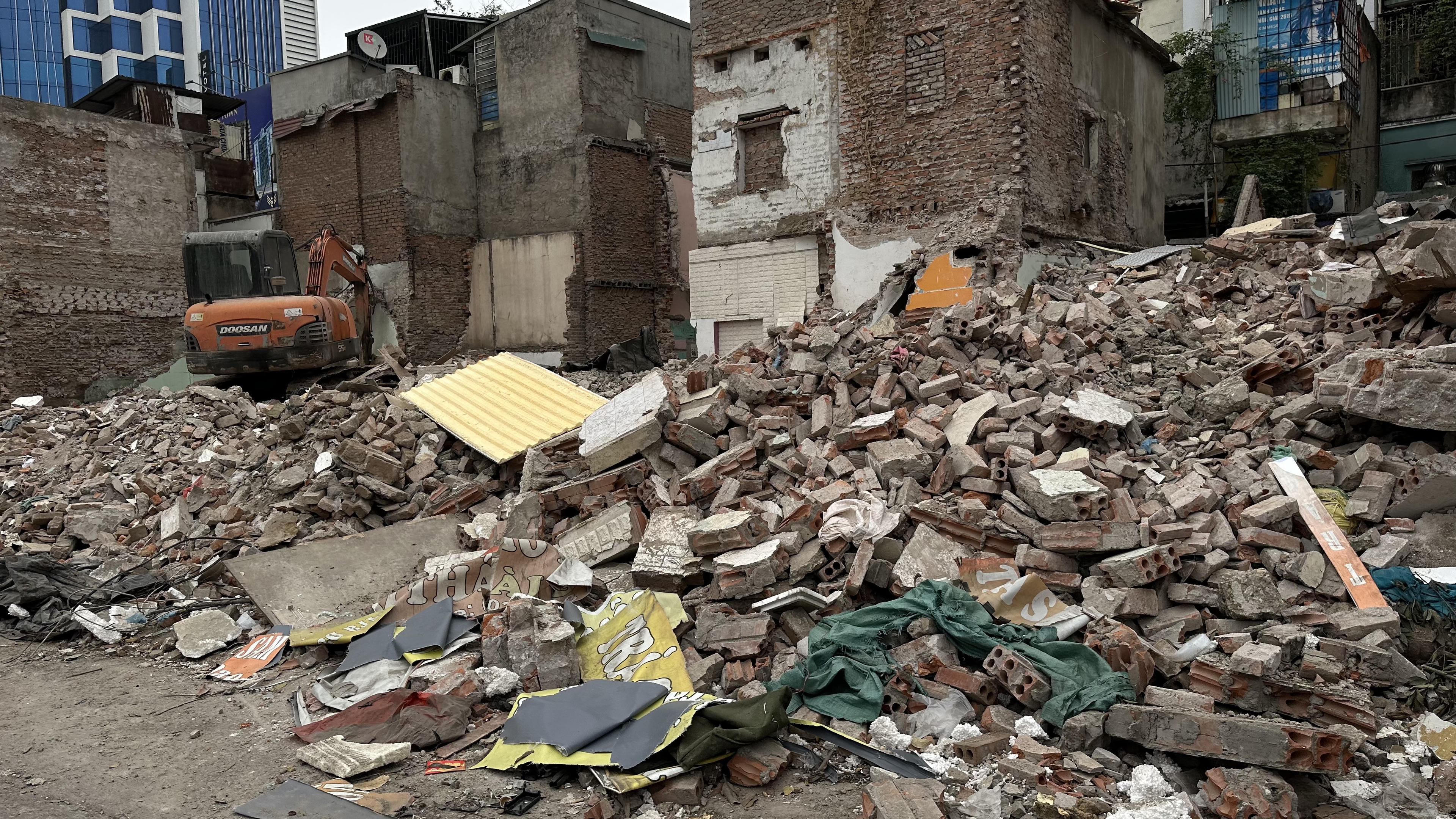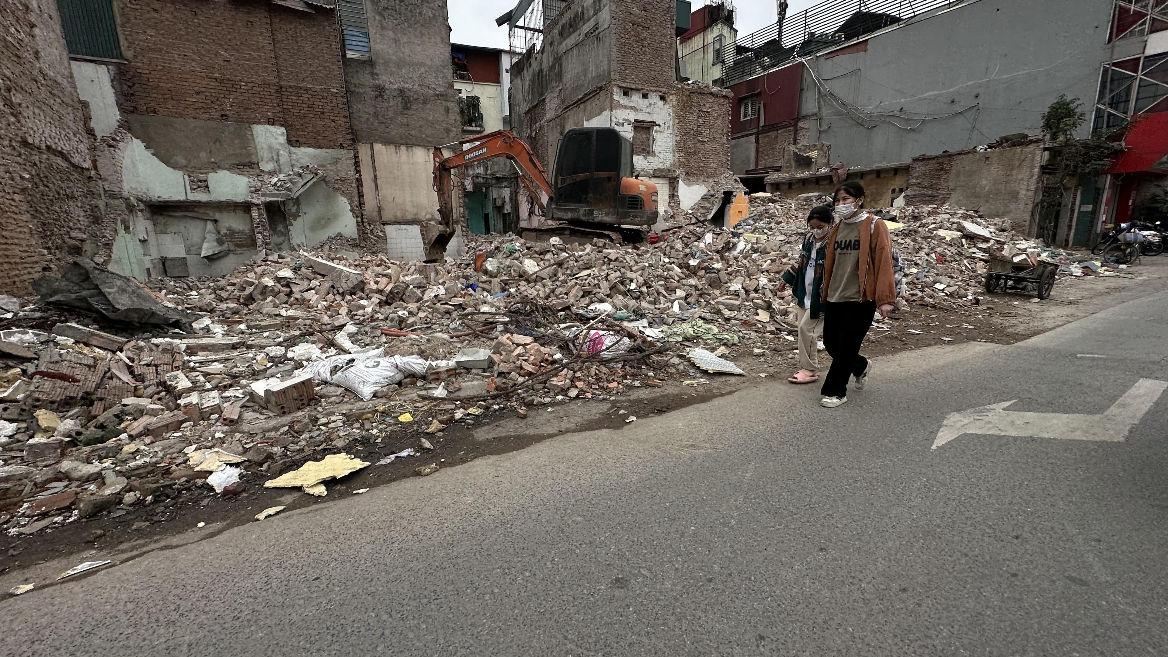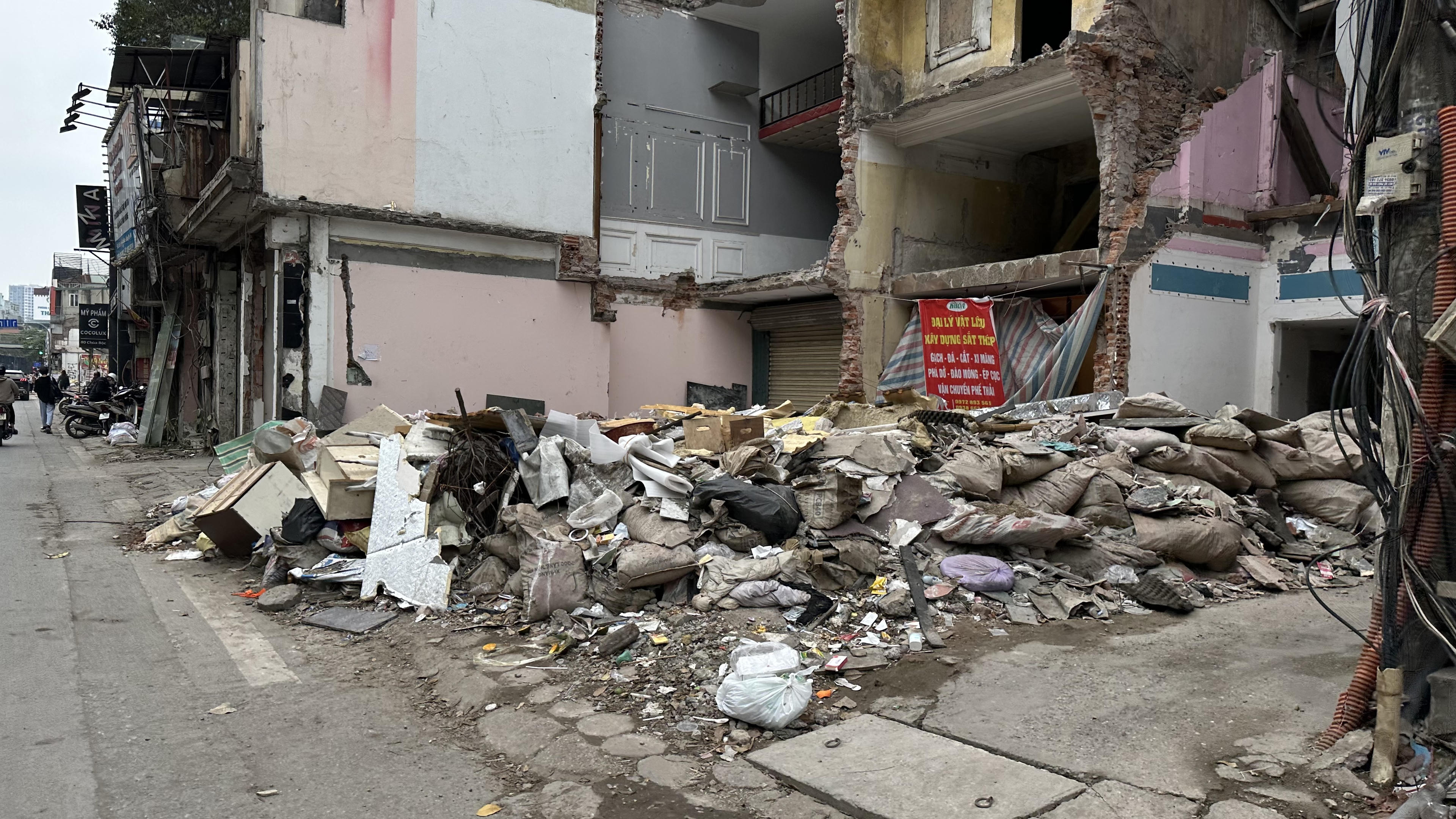 Những ngôi nhà sau khi đập phá để xây dựng lại nhưng cũng không được thu gom dọn dẹp, khiến người đi bộ phải đi xuống lòng đường.Ghi nhận trên phố Chùa Bộc. |