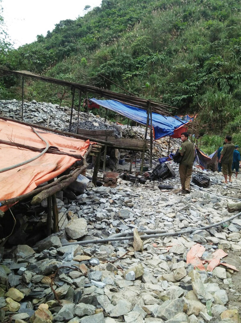 Đoàn đã lập biên bản xử lý bắt tháo dỡ các phương tiện, tiêu hủy máy móc, lán trại tại chỗ gồm 6 lán trại, 5 máy đông phong, đập phá 4 máy nghiền đá, 2 bộ phát điện, trục xuất những đối tượng hoạt động khai thác ra khỏi hiện trường, ký cam kết không tái phạm về hoạt động khai thác vàng tại các địa bàn các xã.